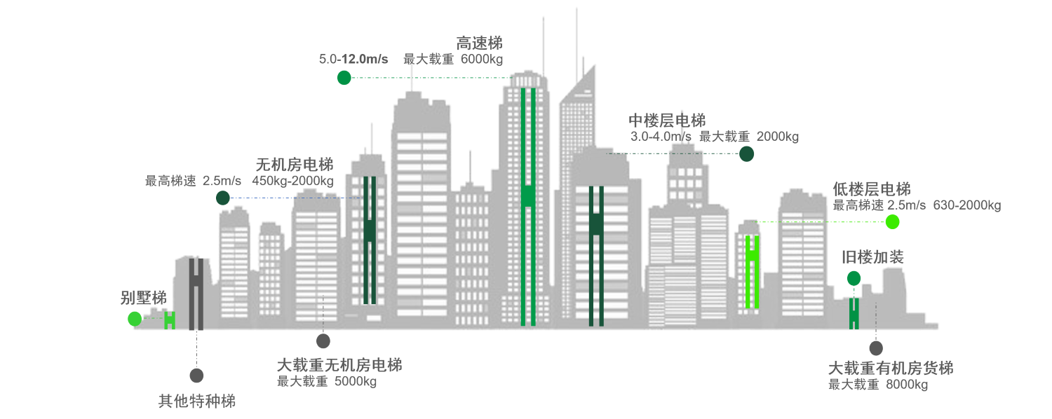 우리는 최대 부하 용량이 6000kg(2:1 비율)이고 최대 속도가 12m/s(1:1 비율)인 애플리케이션 시나리오에 적합한 다양한 견인 기계와 그에 맞는 메인프레임을 제공합니다. 고객은 엘리베이터 매개변수를 기반으로 적합한 모델을 직접 선택할 수 있어 설계 주기가 크게 단축됩니다.